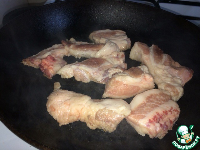 2) На очень раскалённую сковородку выкладываем наше мясо и жарим до золотистой корочки ( буквально по полтора минутки). Все мясо за раз, не жарим!!! а то оно пустит сок и начнёт тушится, а не жарится.