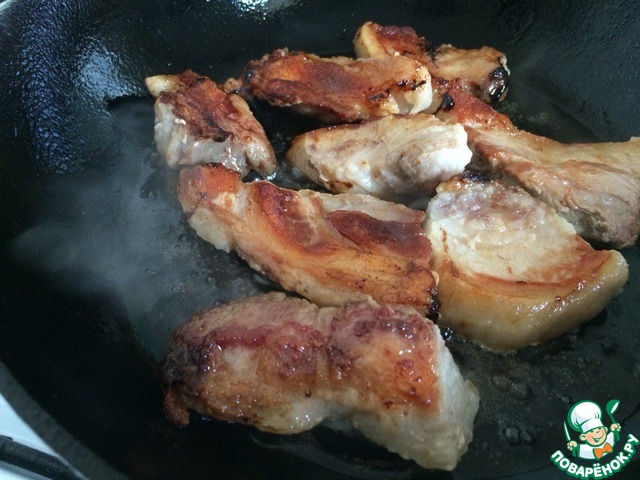 3) Когда мясо пожарится добавить к нему 1 стакан воды, соль, перец, лавровый лист и уксус и потушить на сильном огне 10 минут.