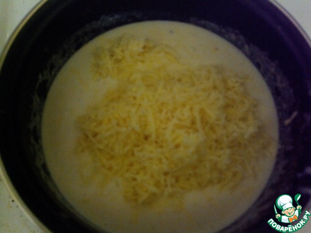 Добавляем 1,5 стакана молока комнатной температуры и хорошо размешиваем минуты 2-3. Добавляем мускатный орех и соль по вкусу (Но не забывайте, что сыр также соленый!). Как только соус начнет закипать, добавляем в него, предварительно натертый на мелкой терке сыр. Делать это лучше небольшими порциями, постоянно помешивая до полного растворения.