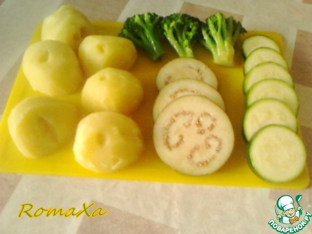 Подготавливаем овощи. Картофель чистим, разрезаем на половинки и отвариваем до полуготовности. Отрезаем три кружка баклажана и шесть кружков цукини толщиной по одному сантиметру. Брокколи я взял три крупных замороженных соцветия, разморозил их.