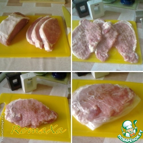 Берём три куска корейки (вес я указал приблизительный), хорошенько отбиваем, солим, перчим, кладём один на другой, заворачиваем в плёнку или пакет и убираем в холодильник. Пока будем готовить всё остальное, мясо, как раз, промаринуется.