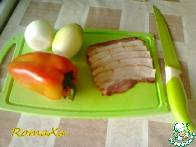 Пришла осень, стало прохладней и я решил "утеплить шапку" варёно-копчёной грудинкой. Ну, а для более интересного вкуса, болгарский перец и, конечно, репчатый лук. Грудинка у меня в нарезке, взял из расчёта две полоски на одну отбивную, вес составил 100 г.