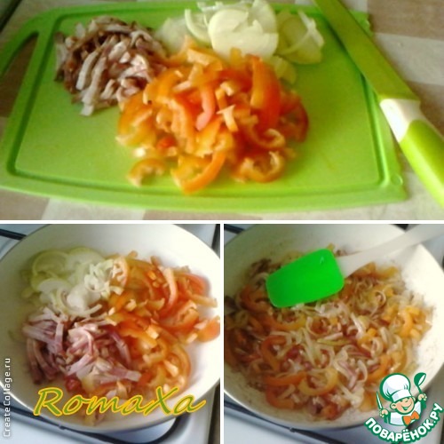 Грудинку и перец нарезаем соломкой, лук полукольцами и слегка обжариваем.