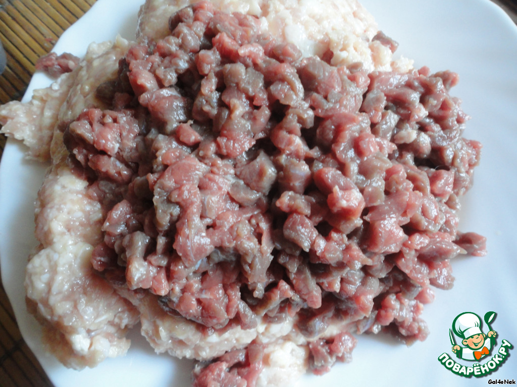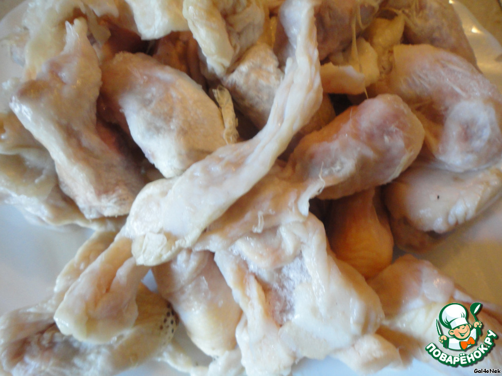 Если у Вас нет замороженных ранее шкурок, как я и писала в описании, "изготовьте" их из ножек, а из мяса приготовьте фарш. А еще лучше мясо не молоть в мясорубке, а порезать маленькими кубиками. Но я купила куриный фарш.