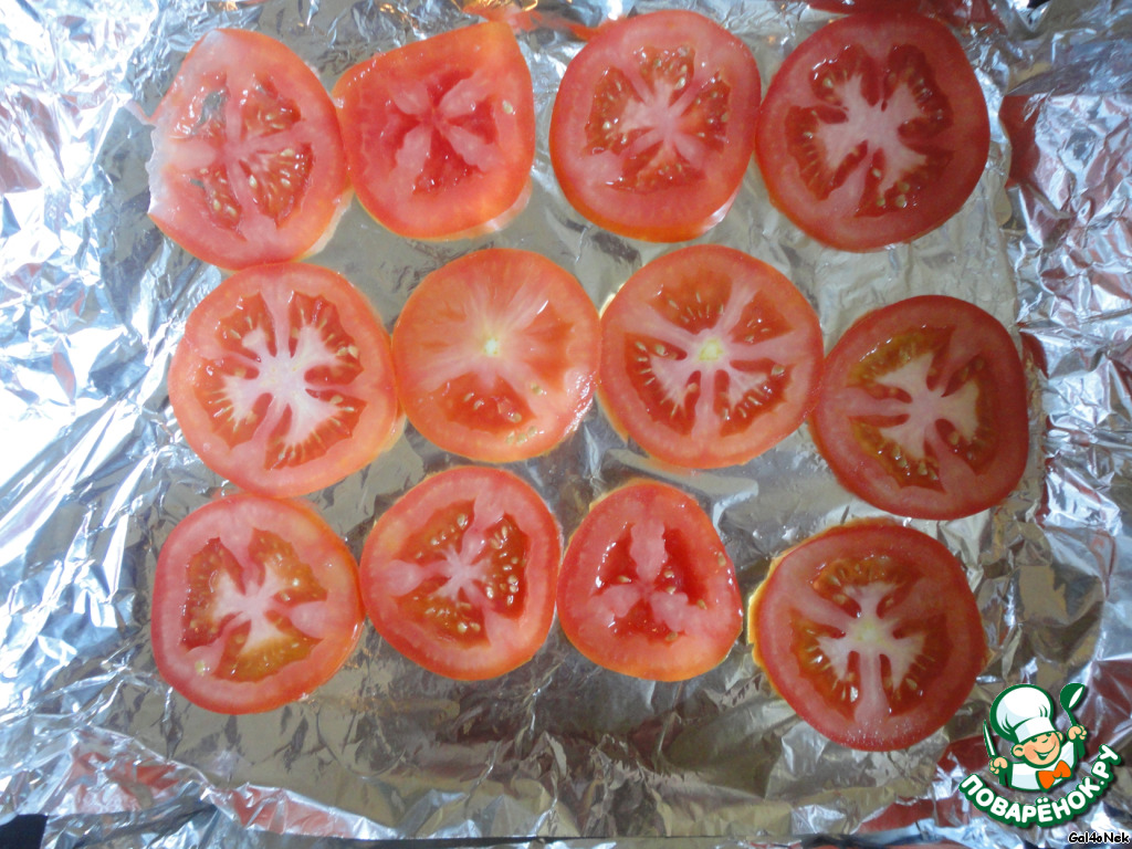 Стелим на противень фольгу, помидоры режем кольцами и выкладываем на фольгу.