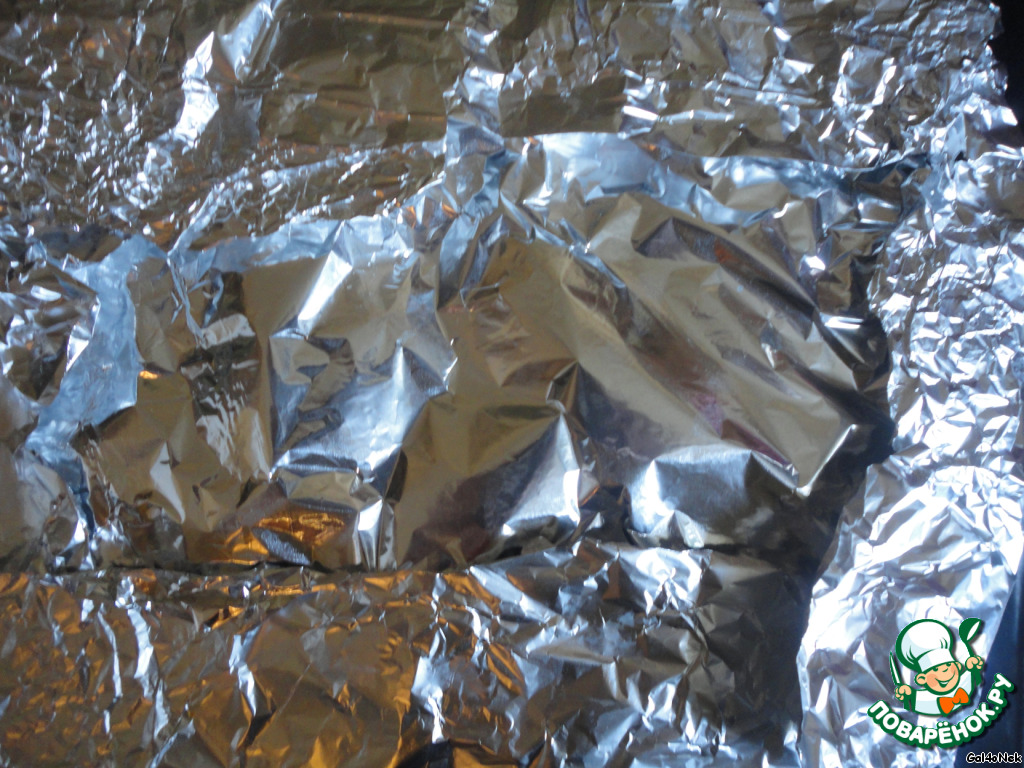 Сверху кладем меньший кусок фольги, заворачиваем конвертом. И отправляем в духовку при 180-200 градусах.