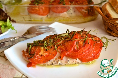 5. Смазать форму для запекания оливковым маслом. Выложить куриные грудки, каждую накрыть ломтиками помидора и несколькими веточками эстрагона. Посолить и поперчить. Сбрызнуть оливковым маслом. Запекать 25-30 минут. Подавать курицу холодной или горячей с салатом и хлебом.