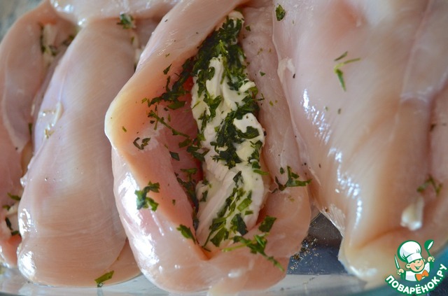 1. Разогреть духовку до 200. Обрезать жир с грудки. Сделать надрезы, чтобы получился кармашек.