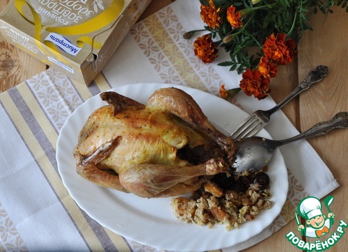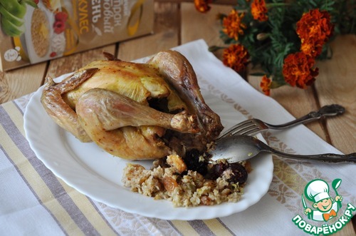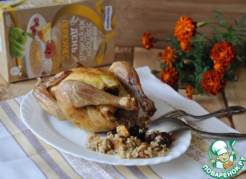 | Даже те, кто не уважают овсянку, непременно оценят эту вкусную и полезную курочку, фаршированную овсяными хлопьями и сухофруктами. |