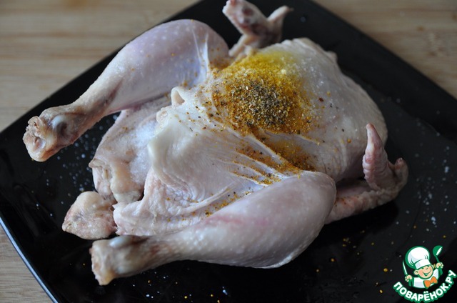 Посыпаем солью, свежемолотой смесью перцев, карри, поливаем растительным маслом и всё тщательно натираем.
