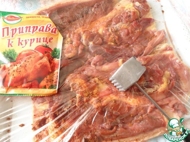 Накрываем тушку пищевой плёнкой и немного отбиваем. Отставляем в сторону.
