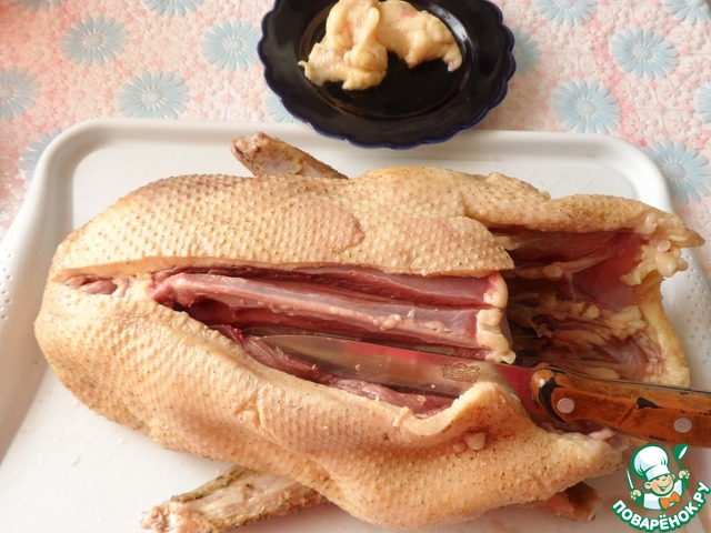 Убираем из утки лишний жир, отрезаем шею и начинаем самый кропотливый процесс разделывания утки. Делаем разрез ножом до кости и осторожно немножко обрезая при самой кости отворачиваем шкуру в обе стороны. Не страшно если шкура немножко порвется, всё равно будет закручиваться в рулет. Сначала кажется, что страшно и не справишься, но, поверьте, это совсем не трудно. И результат того стоит.
