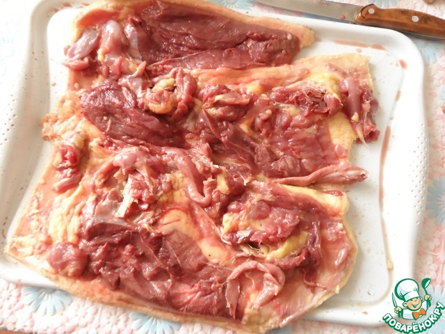Вот такое у нас получается развёрнутая тушка. От которой обрезаем ещё жир, где остался, солим и перчим с обеих сторон. Рекомендую еще смазать смесью мёда и горчицы. Обрезаем, где потолще кусочки мяса и равномерно раскладываем по всей тушке. Посыпаем всё специями.