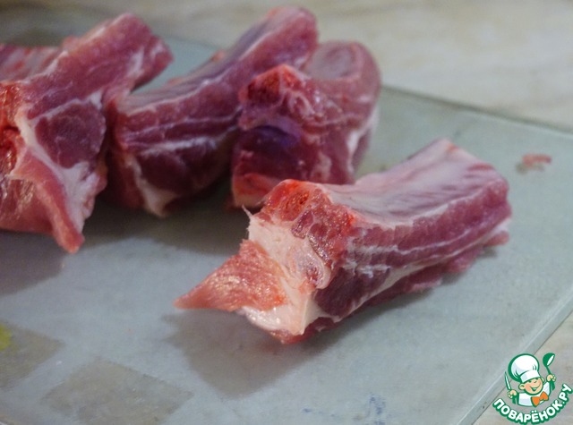 Для ускорения процесса приготовления, включаем электрочайник и доводим воду в нем до кипения. Тем временем режем ребра. ПыСы: я готовила только себе, т. к. кроме меня в моем доме ребра свиные никто не любит, поэтому приготовила 3 шт. и маринада приготовила меньше, но в ингредиенты написала в расчете на 0,5 кг ребер.