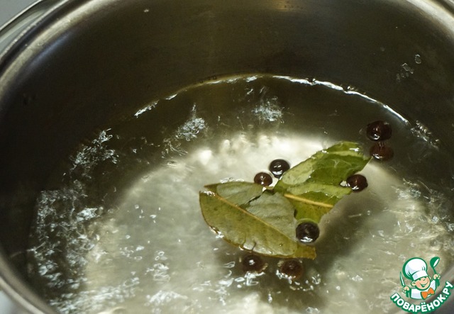 Закипевшую воду переливаем в кастрюлю, добавляем соли в два раза меньше, чем, если бы Вы варили обычный бульон, т. к. в маринаде присутствует соевый соус. Также добавляем лавровый лист и перец и доводим снова до кипения.