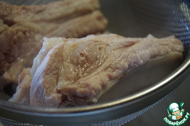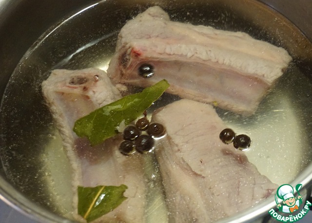 Опускаем ребра в кипяток и варим 5-7 минут. За это время они дойдут до полуготовности, а потом доготовятся в духовке. Ну а благодаря тому, что мы опускаем ребра в кипяток, они остаются сочными.