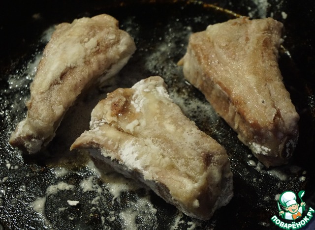 Продолжаем приготовление ребер. Для того, чтобы ребра лучше соединились с глазурь-маринадом, из нужно обвалять в крахмале.