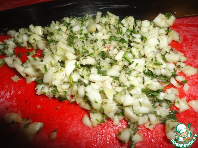 К чесноку, тимьяну и розмарину добавляем щепотку соли и рубим ножом. Соль помогает чесноку и зелени пустить соки и хорошо этим сокам перемешаться.