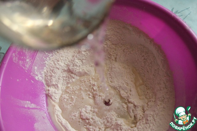 Просеять муку с разрыхлителем и солью (1/2 ч. л.), добавить ледяную воду и хорошенько перемешать.