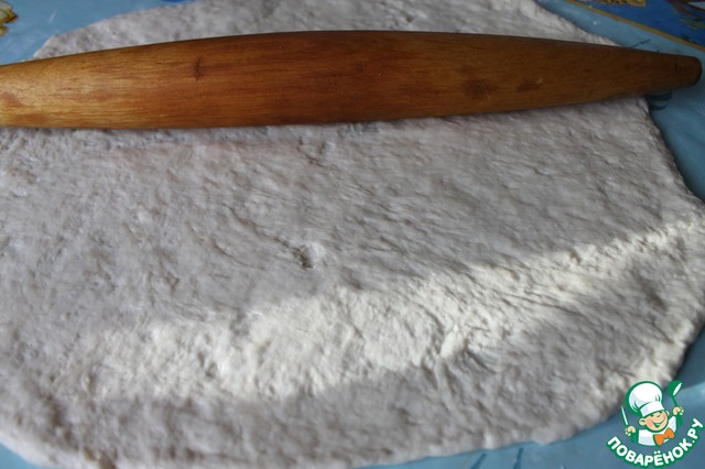 Достать тесто, немного приплюснуть и снова раскатать, но не очень тонко, придать форму круга (впрочем это зависит от вашего желания). Не забудьте кусочек теста оставить для оформления.