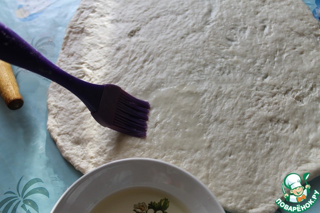 Полученный "блин" обильно смазать маслом. Делала и с растительным, и со сливочным; со сливочным понравилось больше.