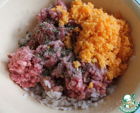 Тем временем подготовим фарш. К фаршу добавить измельченные в блендере морковь и лук. Посолить и приправить прованскими травами. Я ещё в фарш добавила немного риса, чтоб получилось не очень жирно, но это дело вкуса. Всё хорошенько смешать.