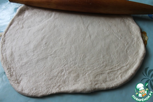 Замесить эластичное тесто, добавив 1ст. л. растительного масла (способствует большей эластичности и поможет избежать прилипания к рабочей поверхности). Раскатать тесто в тонкий пласт.