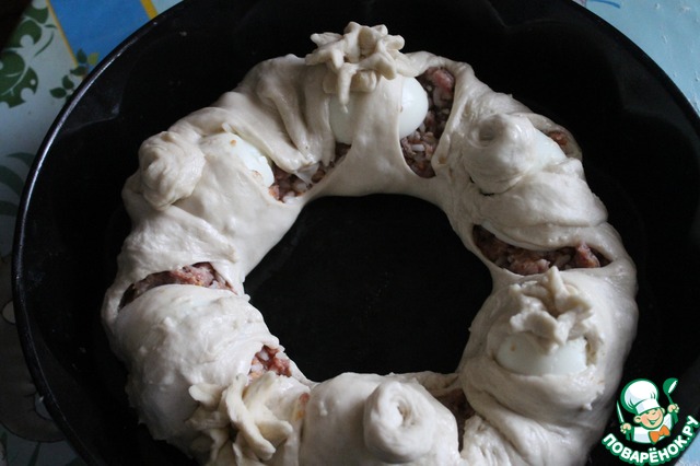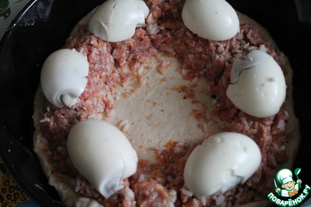 Форму для выпечки смазать растительным маслом. Аккуратно переложить в неё тесто. На тесто по кругу выложить фарш, оставляя пустыми края и центр. Я тесто сделала из половины нормы и ощутила его нехватку, от края надо бы отступить побольше, чем у меня вышло на фото. Сверху фарша выложить половинки яиц.