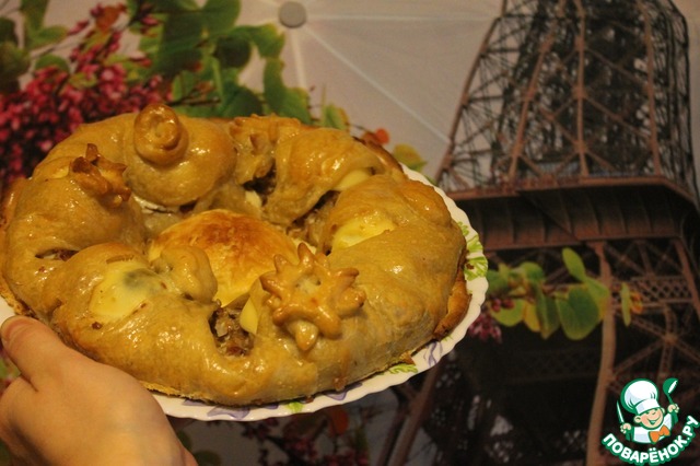 Затем сформировать рулет - края загнуть поверх яиц, от центра тесто крест на крест надрезать до фарша на 8 частей. Получившиеся треугольники также загнуть поверх яиц. Из оставленного кусочка теста приготовить любые фигурки и украсить рулет по своему вкусу. У меня - розочки и звездочки.