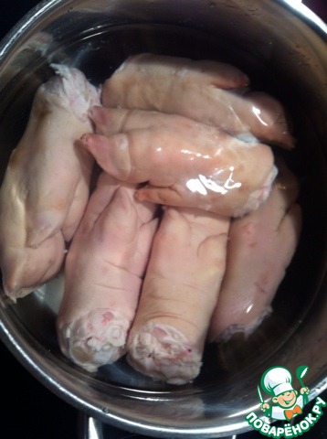 Свиные ножки промыть, замочить на 3-4 часа, еще раз хорошо промыть. Положить ножки в кастрюлю.