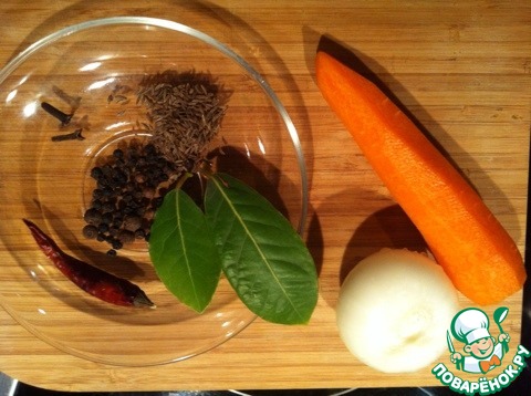 Положить туда же очищенную морковь, головку лука и все специи.