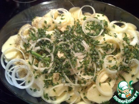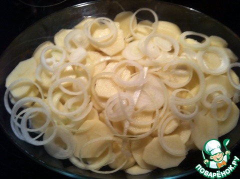 В форму, в образовавшийся сок разложить очищенный и нарезанный кружочками картофель. Посыпать его колечками лука.