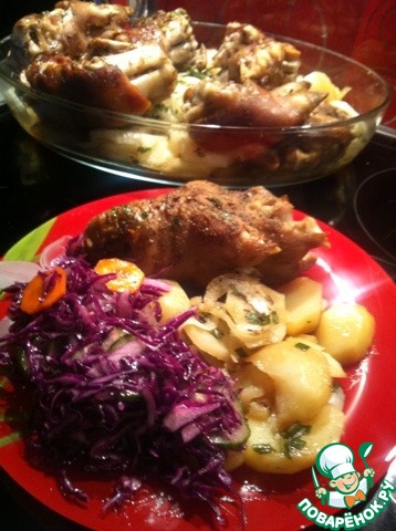 Наши ножки на картошке готовы!!! К ножкам подойдет салат из краснокочанной капусты с огурцом, луком и морковью, заправленный бальзамическим уксусом, щепоткой сахара и соевым соусом.