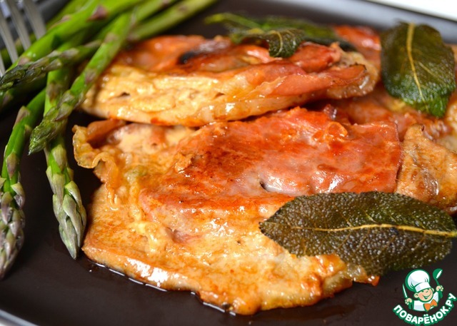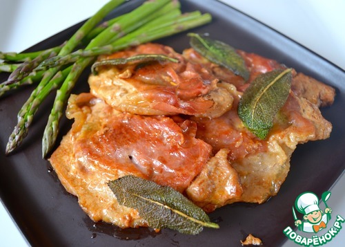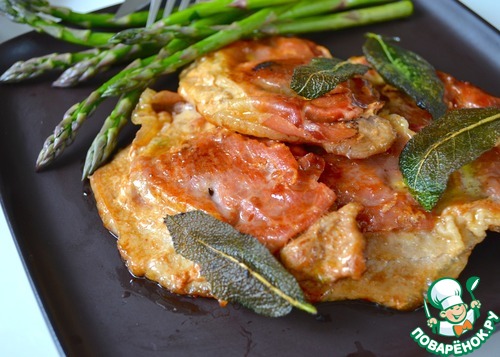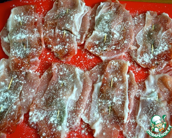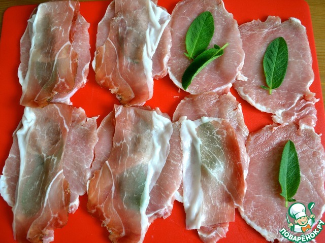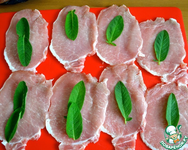 Мякоть свинины нарезать ломтиками толщиной примерно 1 см. Как следует отбить их и уложить на стол рядом друг с другом. Поверх каждого кусочка положить листик шалфея (можно два!).