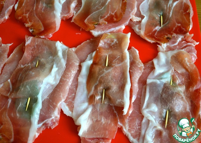 Сверху накрыть тонкой полоской копченой грудинки.