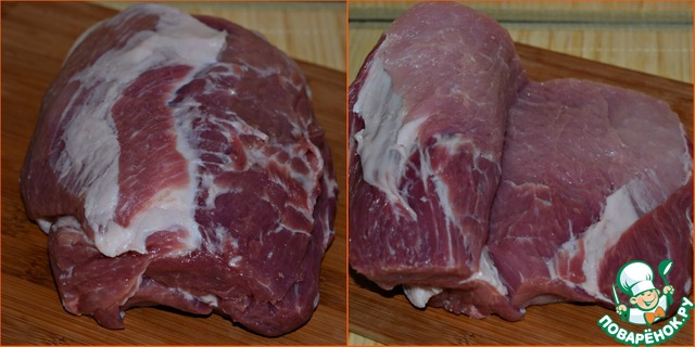 Подготовим мясо. Свинину вымыть, обсушить бумажным полотенцем. Разрезать пополам вдоль, почти до конца, как книгу. Посолить, поперчить.