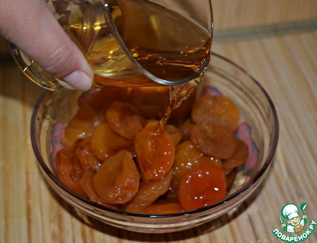 Половину кураги измельчить в блендере, оставшуюся часть порубить ножом. Сок, в котором была замочена курага, не выливаем!