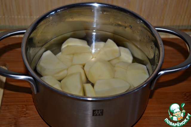 Картофель почистить, порезать довольно крупными кусочками. Варить до полуготовности.