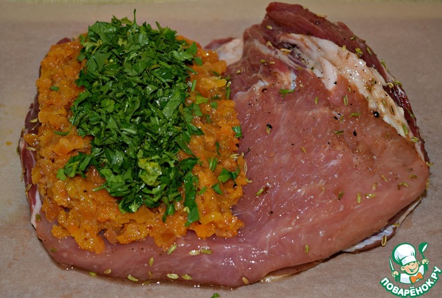 На нижний слой замаринованного мяса выложить начинку из кураги. Сверху выложить измельчённую петрушку.