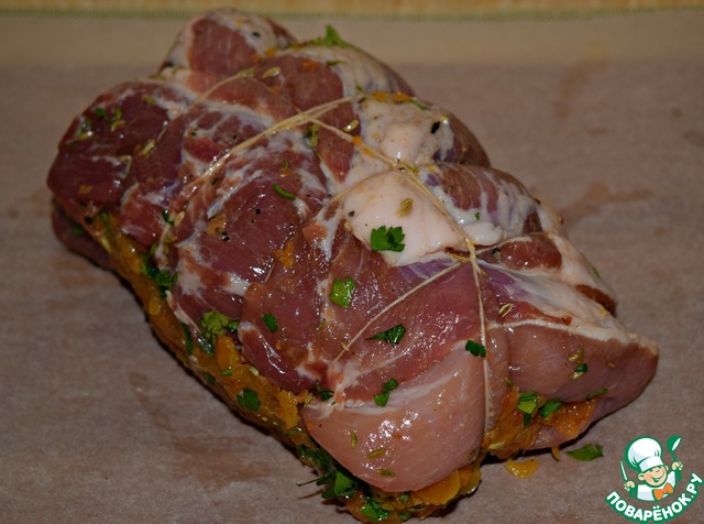 Начинку накрыть верхним слоем мяса и перевязать нафаршированный кусок свинины кулинарной нитью.