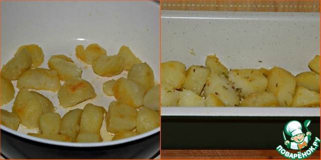 Отваренный картофель прогреть на сковороде с добавлением оливкового масла в течении 3-4 минут. Приправить семенами фенхеля. Выложить в форму для запекания.