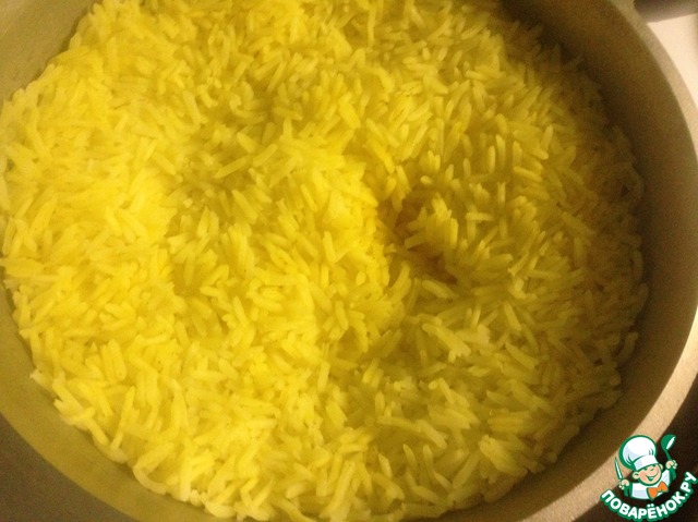 Отдельно в большом количестве воды отварить до готовности рис с солью и 1 чайной ложкой карри. Карри придаст рису красивый цвет и аромат.