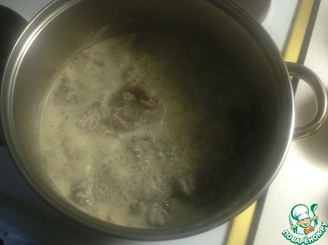 Порезать мясо на небольшие куски, хорошо промыть, выложить в кастрюлю и залить водой так, чтобы она полностью покрыла мясо. Добавить 1 ч. ложку соли и варить 40-50 мин. на хорошем огне без крышки до выкипания 2/3 воды.