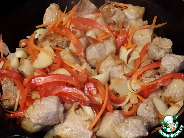 Итак раскалите сковороду, обжарьте кусочки свинины со всех сторон, затем добавьте овощи и обжаривайте еще 5 минут
