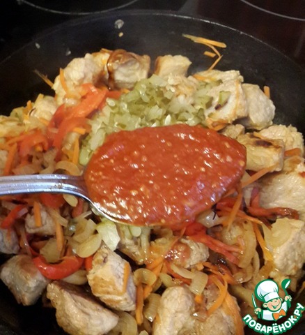 | Кусочки свинины в пикантном соусе со сладким перцем и маринованным огурчиком! |