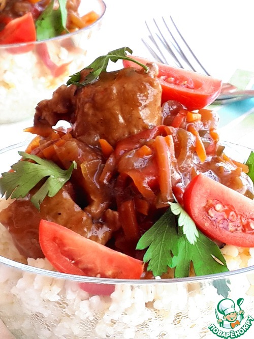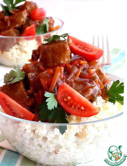 Готовое пшено выложите из пакетиков, сверху положите добрую порцию мяса с с соусом и овощами.