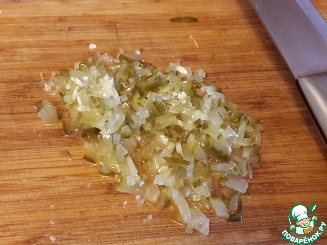 Мелко-мелко нарежьте маринованный огурчик и добавьте в сковороду, перемешайте