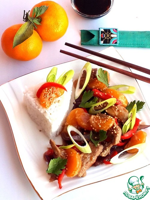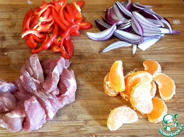 Нарежьте свинину, лук и перец. Мандарин разберите на дольки