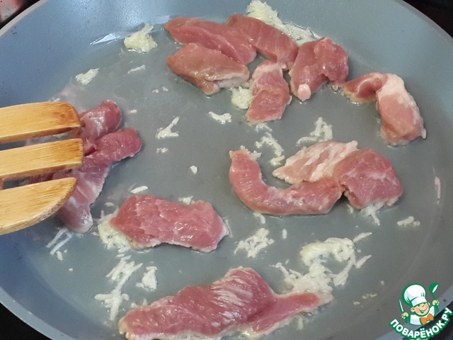 Раскалите сильно масло в сковороде, добавьте туда имбирь и чеснок, как только услышите сильный аромат - добавьте свинину и жарьте, помешивая, до побеления. Огонь должен быть самый максимальный, и убавлять его не нужно!