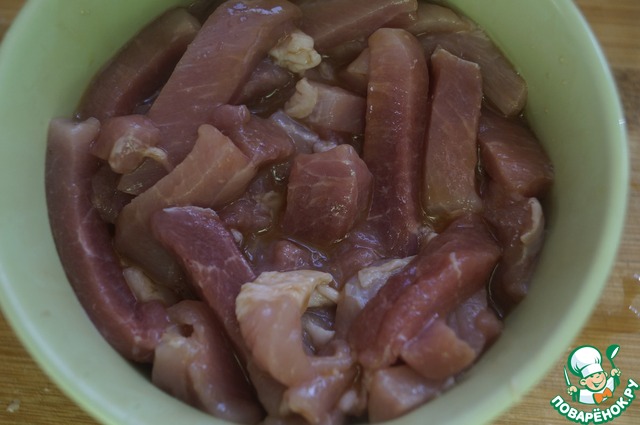 Поставить кипятить воду для приготовления риса. Свинину нарезать тонкими полосками.